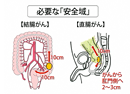 そこで、がんの周辺の組織を含めてしっかり取ってくることを考えた安全な領域(安全域)が定められています。結腸がんの場合はがんの両側を10cmずつ、直腸がんの場合は口側(口に近い側)を約10cm、肛門側は2cmあるいは3cm(肛門からがんまでの距離による)という範囲で腸を切除します。」